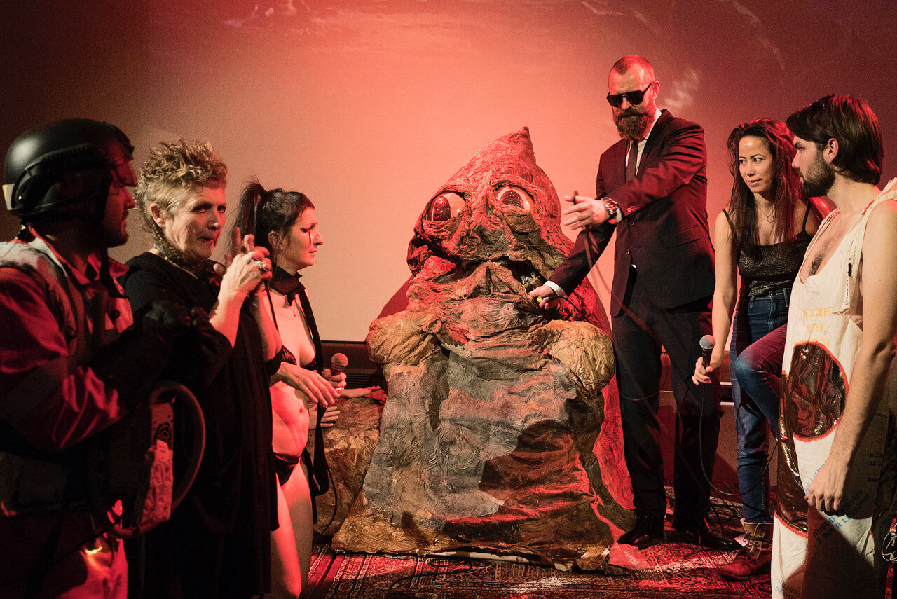 Image: Marvin Gaye Chetwynd: JABBA, I’M BACK! COME BACK TOUR, BOOK NOW! Performance documentation, 29.10.2016, Landmark, Bergen Kunsthall. PRAXES/Bergen Assembly 2016. Photo: Kobie Nel.