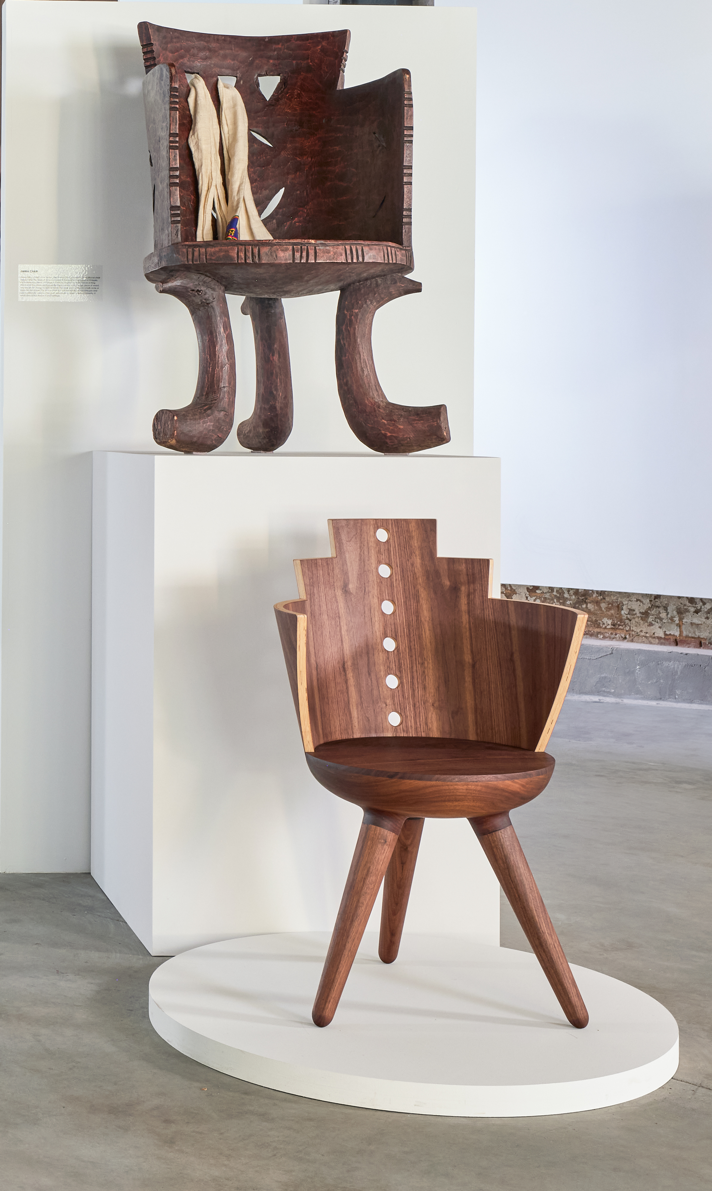 In 2024 I explored this approach in an innovative way via the exhibition Juxtaposed: A Portal to African Design at the Wexler Gallery in Philadelphia. This offered visitors a unique design experience: it elevated and celebrated designs that have inspired my work by exhibiting them alongside, or rather above, my own works. For example, my newest chair was inspired by traditional Jimma chairs, which originate from the region around the town of Jimma in western Ethiopia, and in the exhibition an example of this form of traditional chair was installed behind and above my design.