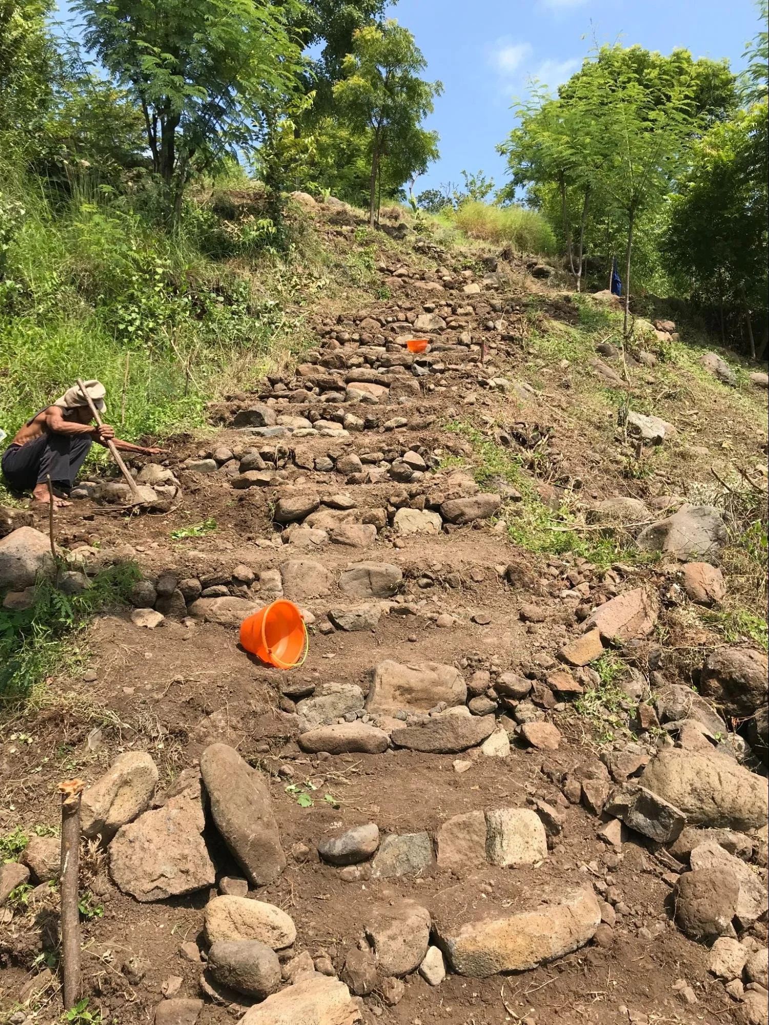 The main goal of the residency was originally the architectural development of a first structure on the site. However, when our group collectively explored the site, one of the first things we registered was its lack of pathways and walkable connections. We rapidly realised the importance of making the site more accessible, not just for ourselves but even more importantly for local people going about their daily routines. The steep terrain and significant height differences of the site presented a challenge. Connections between the lower and higher parts of the site were very dependent on the local climate with its rainy and dry seasons. By improving these connections we aimed to facilitate easier and safer movement throughout the site, while supporting the community in their everyday activities.