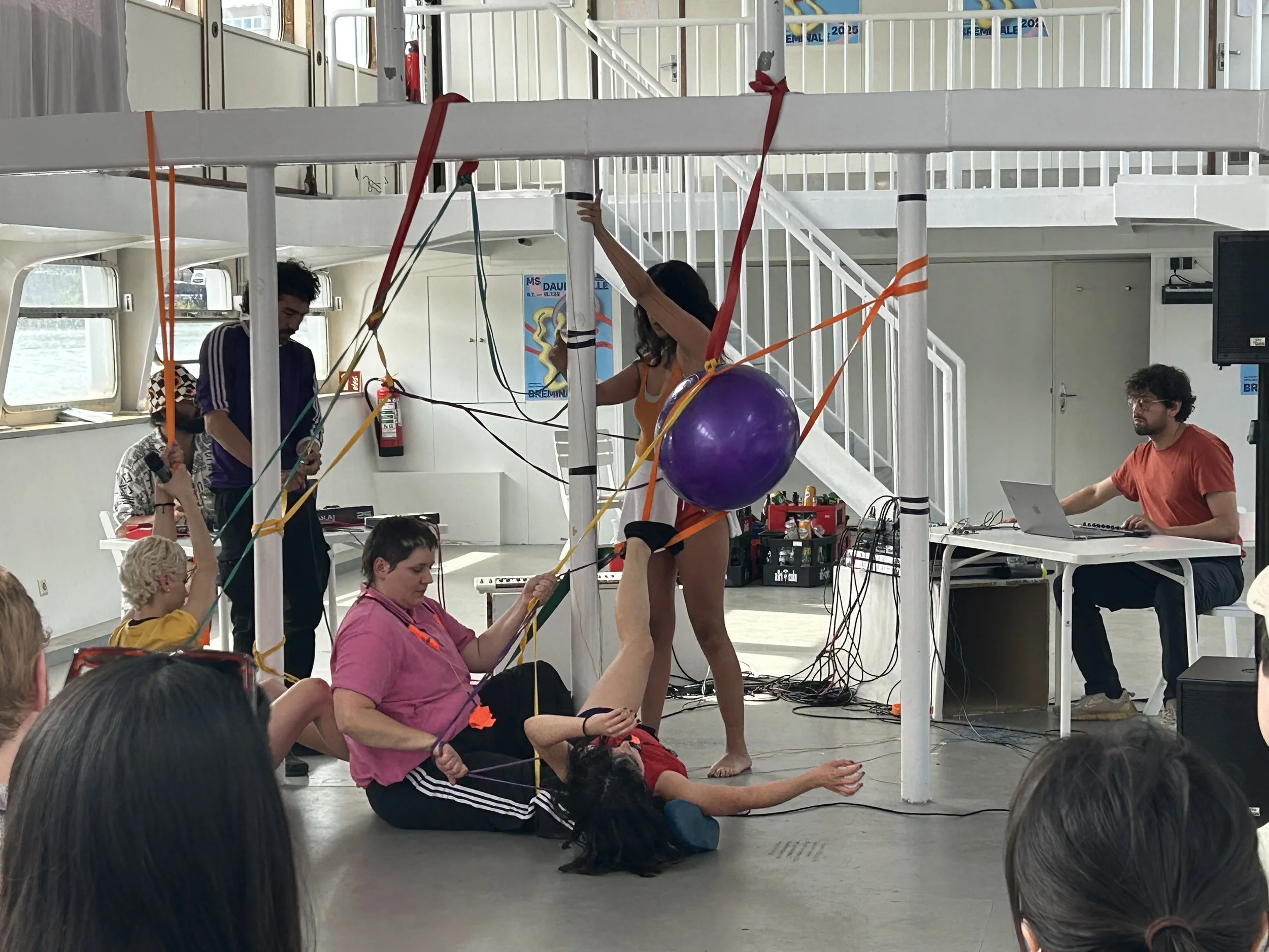2: Elastic Orchestra 2025, Performance with the class Elastic Media at the ship Dauerwelle HfK Bremen. Photo by Victor Artiga.